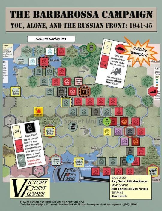 The Barbarossa Campaign recalls the titanic struggle on the Russian Front of World War II as no other wargame has presented it before – as a story filled with drama and pathos using a novel new solitaire gaming system that puts you, the Axis Player, in command facing momentous events – some- times history’s master, and at other times its pawn.